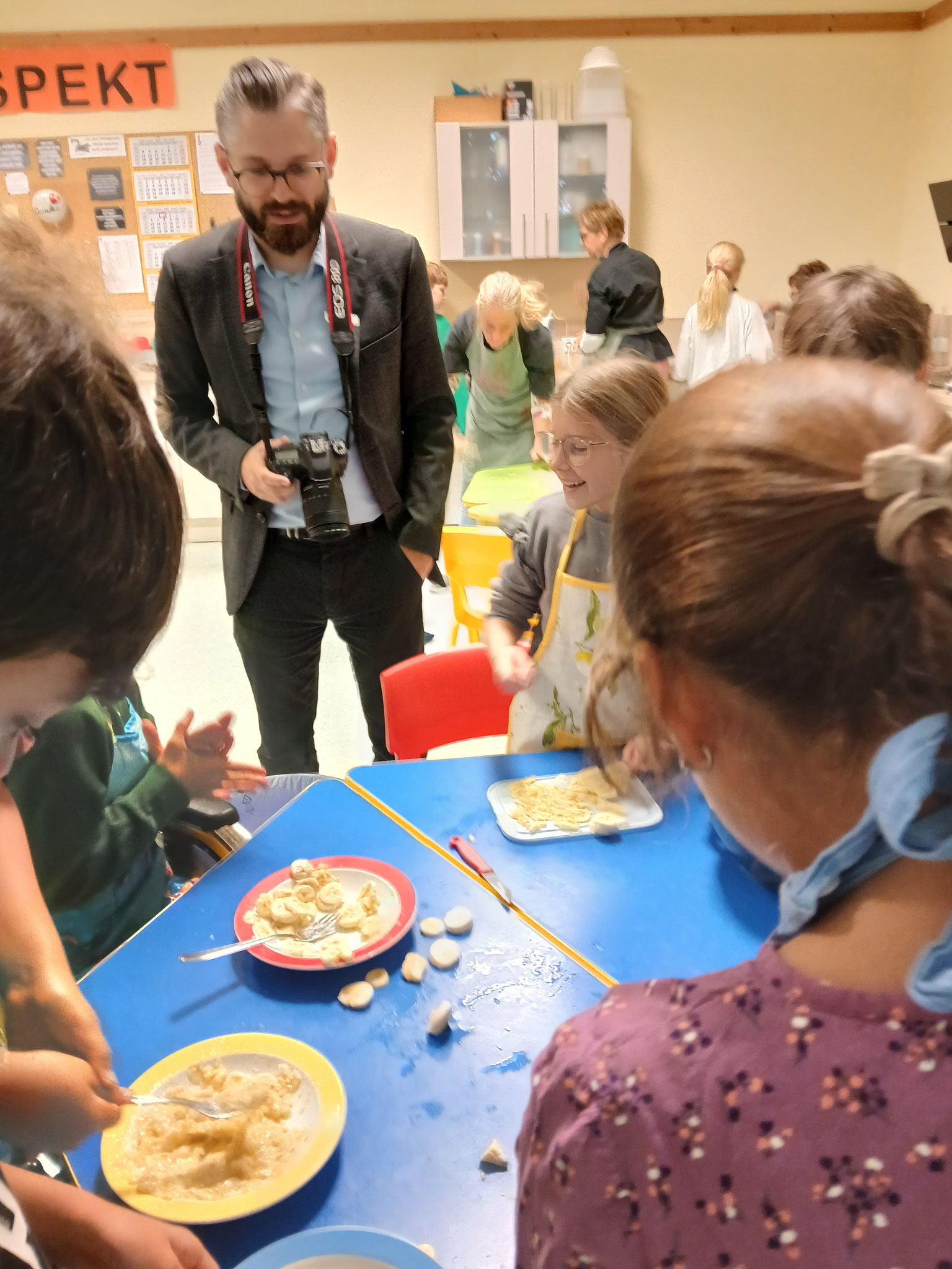Beim Pressetermin am 8.10.2025 mit Sponsoren in der Grundschule Bramstedt/Bassum, konnten die Sponsoren die Kochaktion der 4. Klasse begleiten und direkt sehen, wie eine Kochaktion abläuft. Von der Theorie zum Thema Milch über die praktische Durchführung der Gerichte, wie den Gemüseauflauf, Bananenshake und Knusperwaffeln. Die beiden Landfrauen der Kochaktion und die Kinder servierten den Sponsoren die selbst erstellten Kostproben , die sehr gerne von den Damen und Herren verzehrt wurden.